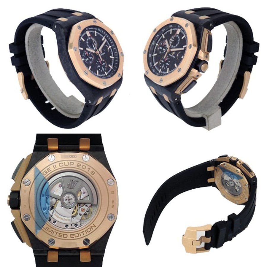The Audemars Piguet Royal Oak Offshore 26406FR.OO.A002CA.01 replica is a luxury watch. It features a 904L stainless steel case with a pink gold. ceramic. and carbon color. The bezel is made of stainless steel and is also pink gold. The sapphire crystal is 44.00 mm in size and 14.45 mm in thickness. The bracelet is made of rubber and is adjustable for all sizes. It has a 904L stainless steel fold clasp in pink gold
