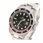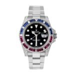 The Rolex GMT-Master II 116718LN is a luxurious replica watch with a 904L stainless steel case and a black dial. It is powered by an automatic Rolex caliber 3186 movement with a 70-hour power reserve and a precision of (-3/+3 sec/day) within COSC certification limits. The case is 40.00 mm thick and is gem-set with a 904L stainless steel bezel. The bracelet is an adjustable oyster-style 904L stainless steel with a fold clasp. The dial features stick/dot indices and stick hands made of 904L stainless steel. The watch has a water resistance of 30m and is covered by a 2-year international warranty.